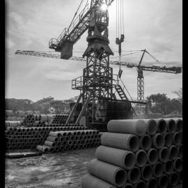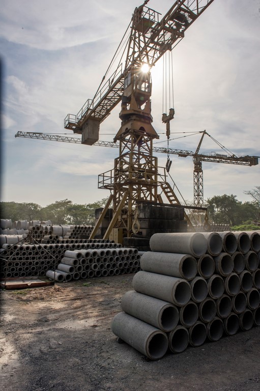 - En un área cubierta de 1.500 m2 donde están instalados los mezcladores de hormigón, las cintas transportadoras de distribución, el puente grúa, máquina elaboradora de roto comprimido con sus moldes, maquina elaboradora de tubos vibrados con sus moldes, los moldes para postes, etc. En el patio de acopio los prefabricados son acomodados y puestos sobre camión con una torre grúa de 10 Tn de capacidad.